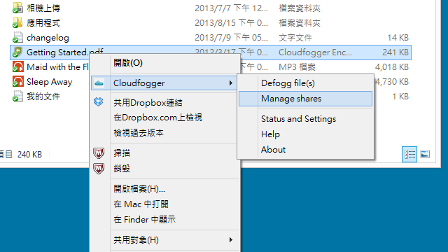 Cloudfogger其实有点类似CryptSync,与云盘无关,它安装完毕后指定某些目录加密——这时就可以选择云盘目录,加密后云端和本地都是密文,本地可以透明使用。
